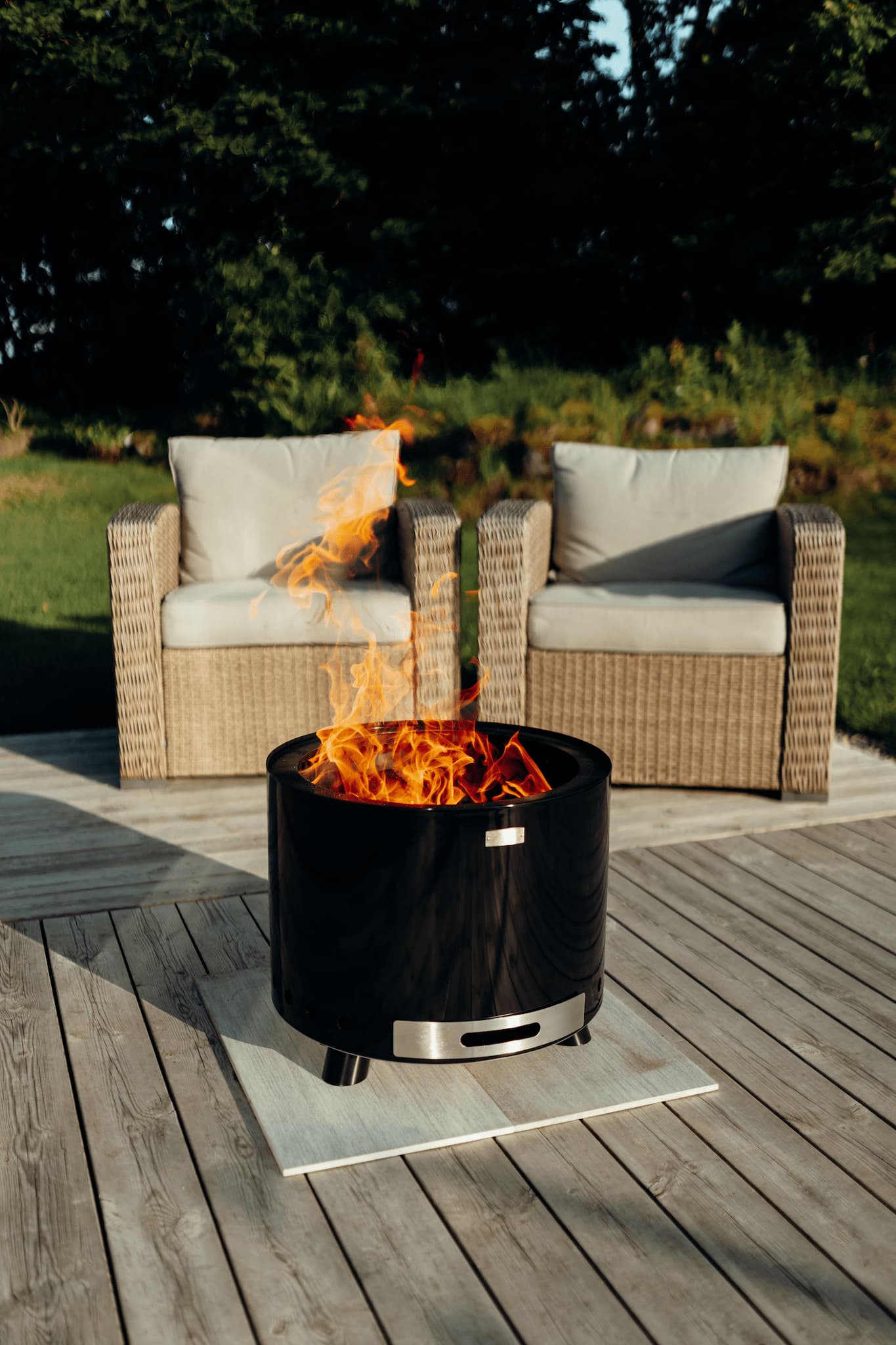 Door de geëmailleerde afwerking ziet de vuurschaal er zelfs na gebruik nog steeds goed uit.