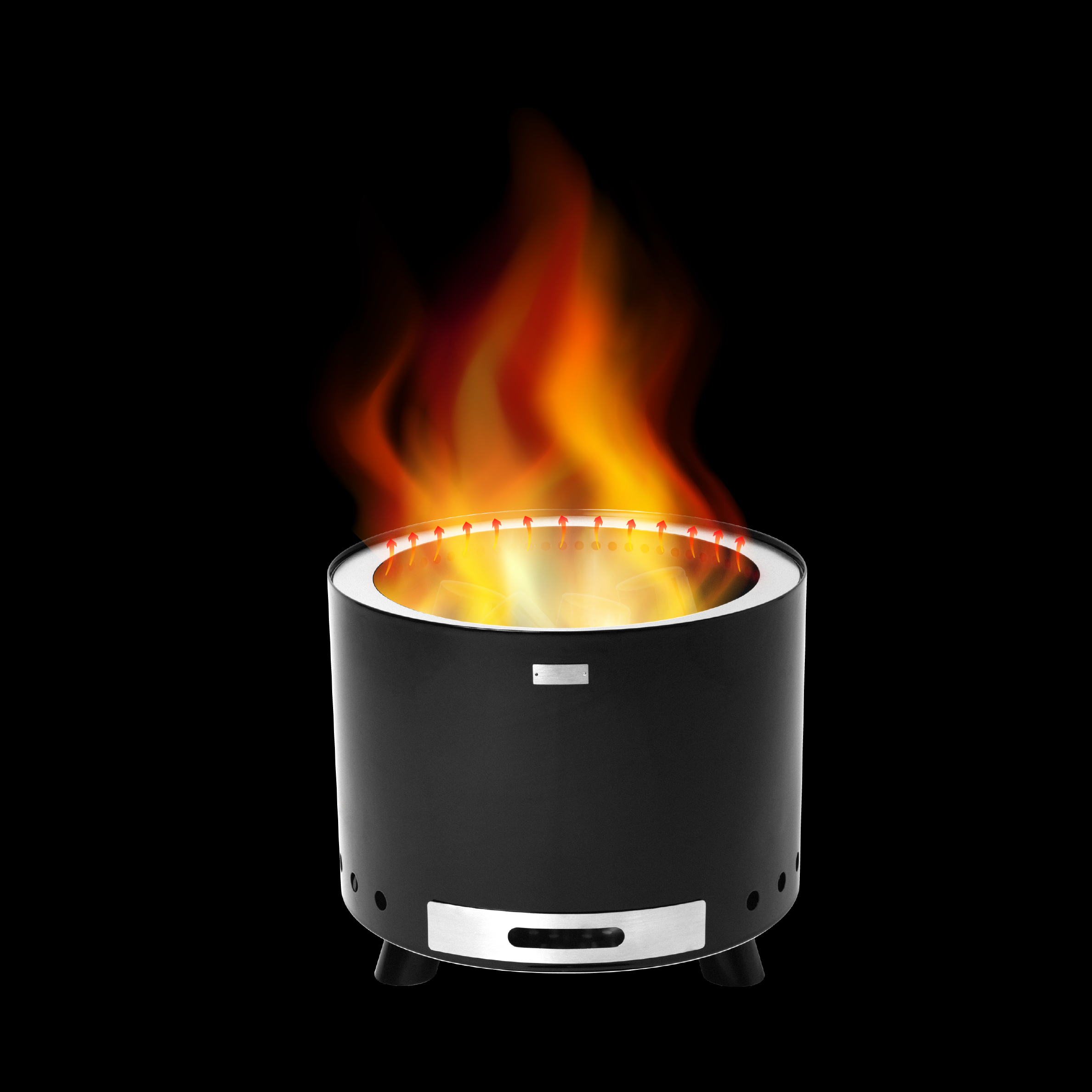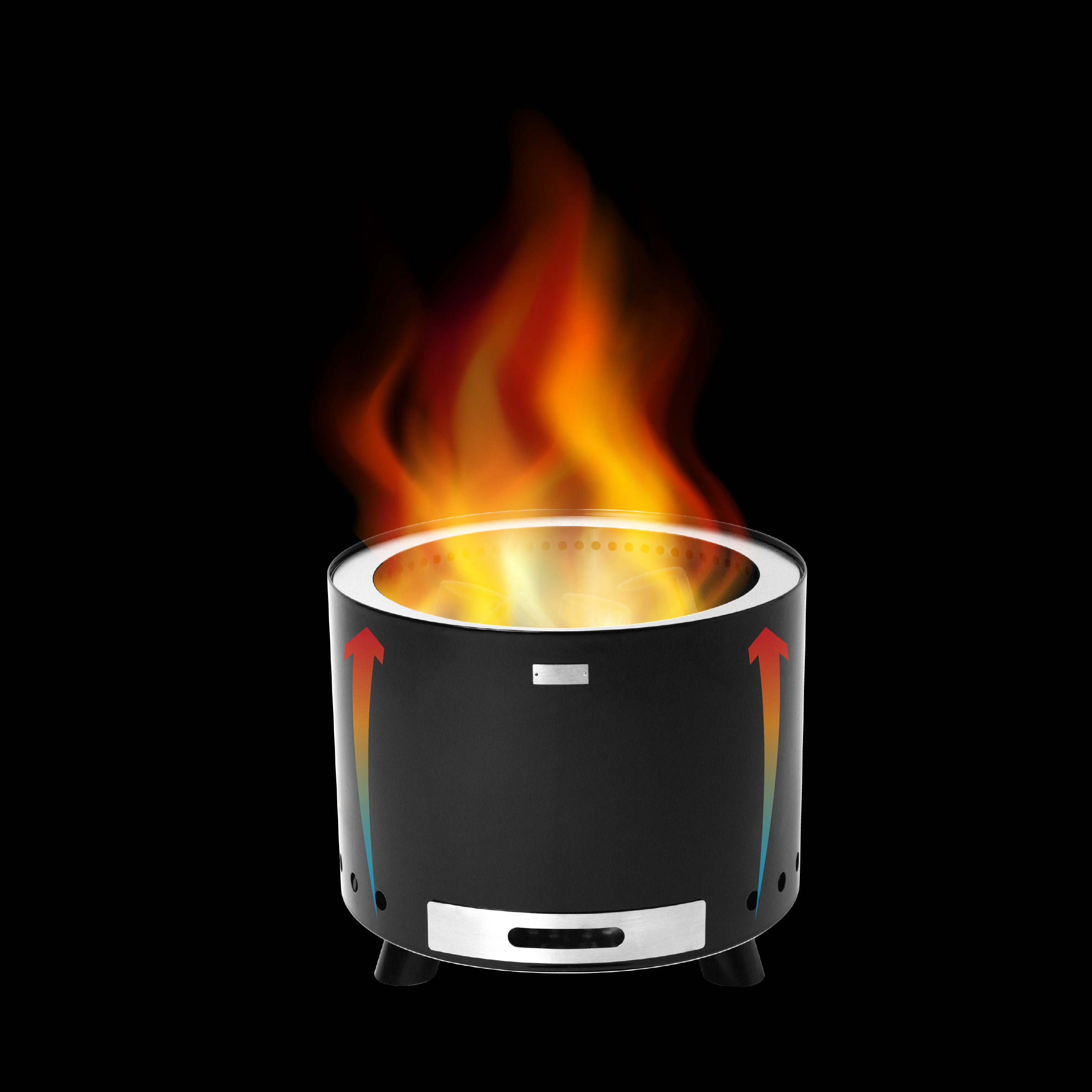 - Lucht komt in een holte aan de onderkant van de vuurschaal en stroomt naar de dubbele wand.
