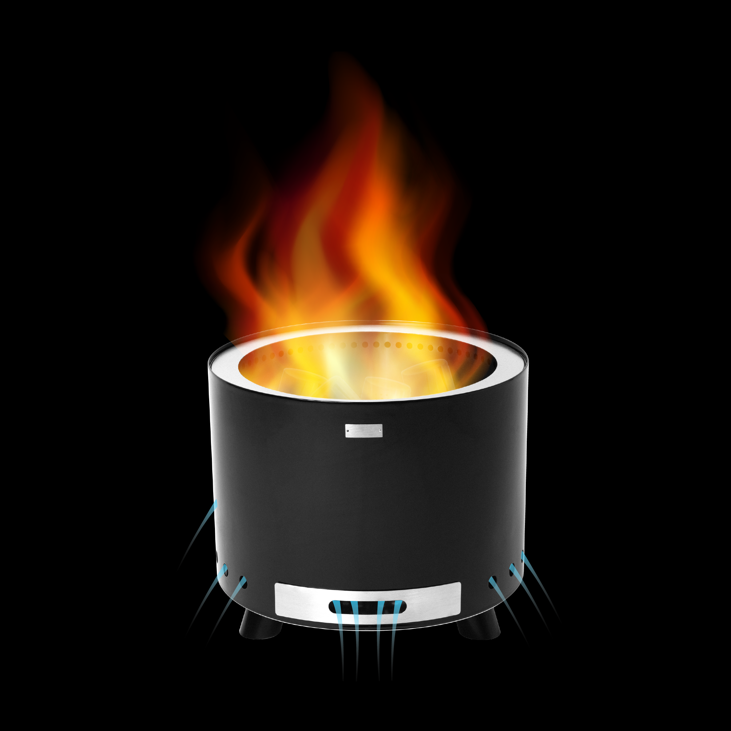 Lucht komt binnen in een holle ruimte aan de onderkant van de vuurschaal en gaat de dubbele wand in. De binnen- en buitenschaal worden door het vuur verwarmd, waardoor de lucht tussen de wanden opstijgt.